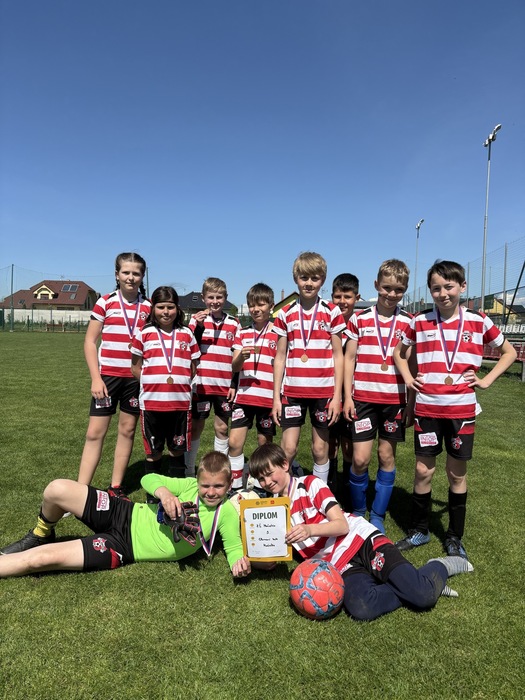 V úterý 22. dubna se na hněvotínském fotbalovém hřišti konal fotbalový turnaj McDonald cup pro první stupeň. Na krásně střiženém trávníku se utkalo celkem 7 základních škol. Znak FC Hněvotín na hrudi reprezentovali Karolína Dadáková, Jakub Dofek, Damián Cikryt, Filip Kravčík, Laura Kovaříková, Šimon Beránek, Tadeáš Pospíšil, Kvido Rozmahel, Jakub Šulc a Filip Vocilka. Hned první zápas jsme sehráli proti ZŠ Heyrovského, která v této soutěži pravidelně hraje celostátní finále. Tomu také odpovídala hra a jednoznačná prohra. Další zápasy ve skupině jsme s přehledem zvládli a díky tomu skončili na druhém místě. V souboji o bronz jsme se utkali s Horka nad Moravou. Začátek zápasu jsme podcenili a tahali jsme za kratší konec. Naštěstí se nám podařilo utkání otočit a získat bronzové medaile.