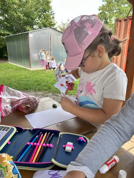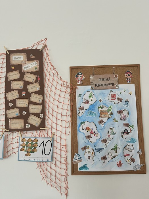 Hurá na palubu! V září jsme s novými prvňáčky vypluli na pirátskou plavbu! Naše dobrodružství začalo přípravou na pevnině, kde jsme si stanovili pravidla, která budou na lodi vládnout. Společně jsme pak pokřtili naši novou loď jménem ŠANGALA - VANGA. Protože každý pirát musí být fit, a dostatečně připravený na dlouhou plavbu, absolvovali jsme veselou rozcvičku. A jelikož se na moři i v hlubinách může vyskytovat leccos nečekaného, každý si nakreslil svoji mořskou příšerku, abychom na ni byli připraveni, až jí potkáme.