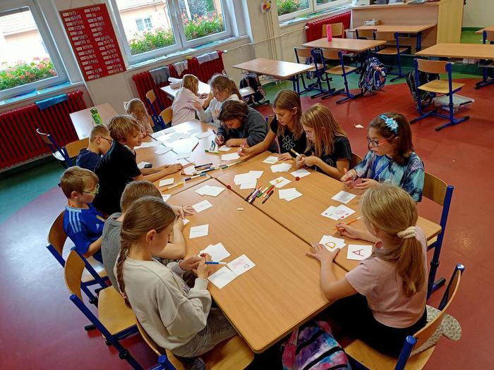 V prvním měsíci nového školního roku jsme se seznamovali s našimi novými žáčky. Během procházky po vesnici jsme si připomněli důležité budovy, jako jsou obecní úřad, pošta, školka, autobusová zastávka a další. Děti také kreslily mapu „Moje cesta do školy“, kde zachytily, kudy každé ráno přicházejí.