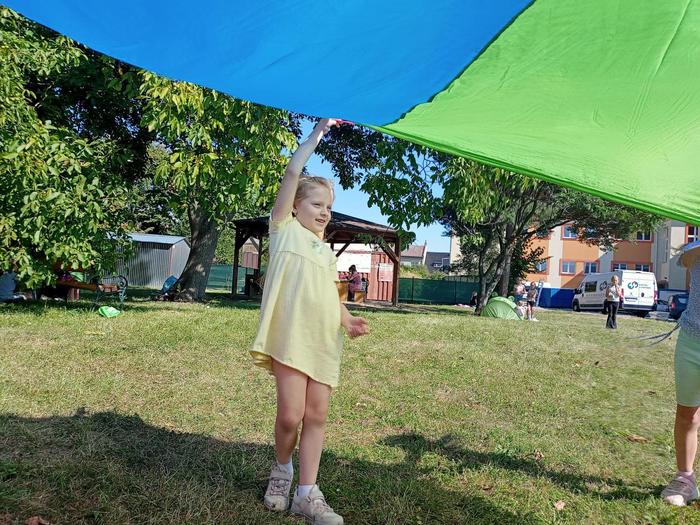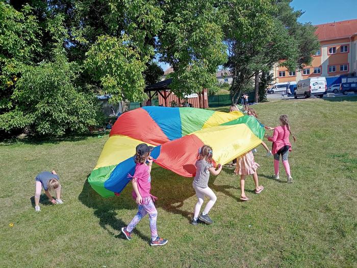 Slunečné dny jsme trávili na školní zahradě – hráli jsme seznamovací hry, jako například vyvolávanou nebo lidské pexeso, odpočívali na dekách a užívali si společné chvíle s kamarády.